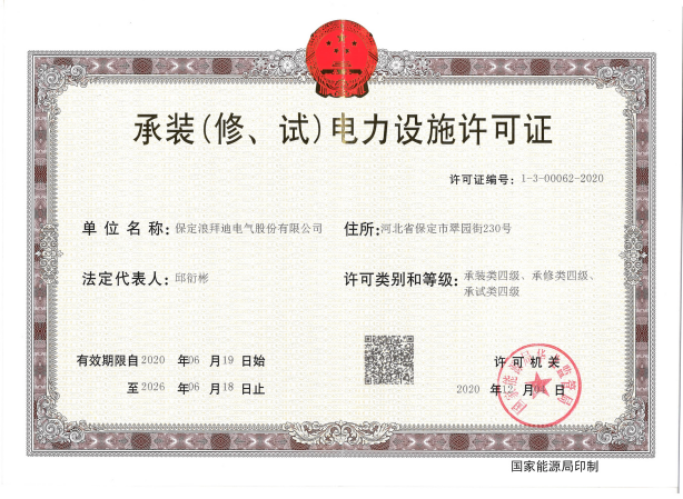 在公司同仁的努力下,公司的電力設(shè)施承裝(修、試)資質(zhì)于2020年6月19日得到國家能源局華北監(jiān)管局的批準(zhǔn),并頒發(fā)許可證。此次權(quán)威認(rèn)證,證明了我公司具備從事電力設(shè)備維護(hù)服務(wù)的能力,將在電力設(shè)備服務(wù)行業(yè)領(lǐng)域獲得更大的發(fā)展空間,為今后開拓服務(wù)業(yè)務(wù)打下堅實(shí)的基礎(chǔ)。